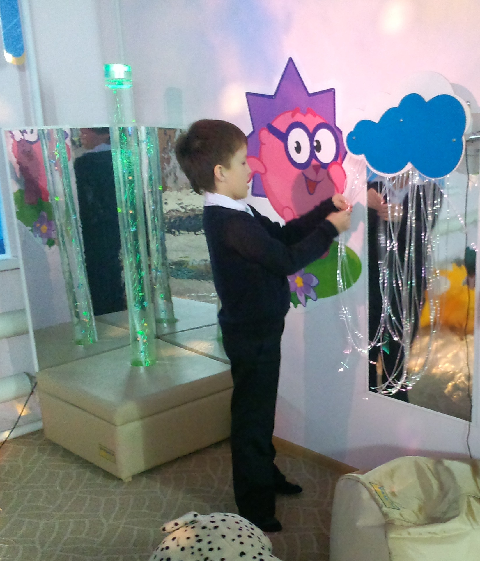 Сенсорный уголок «Зеркальный обман» — состоит из большого мягкого, основания «мягкой платформы», на котором можно сидеть, в основу которого вставлена воздушно-пузырьковая колонна в кол-ве 2 шт. Уголок обрамлен комплектом безопасных зеркал, для дополнительного визуального эффекта расширяющего пространство и создающего искажение, что очень забавляет. В прозрачной колонне из прочного пластика, заполненной дистиллированной водой, поднимаются бесконечное число воздушных пузырьков. Пластмассовые рыбки, которые находятся внутри колонны, начинают двигаться, подталкиваемые пузырьками воздуха. Они, то всплывают вверх, в цветных, переливающихся струях, то падают вниз. Это завораживающее зрелище никого не оставит равнодушными. Если прижаться к пузырьковой колонне, то можно ощутить нежную вибрацию. Пузырьковые колонны, заполненные подсвеченными пузырьками воздуха устанавливаются в различные режимы работы, меняют интенсивность и цвет подсветки, скорость движения пузырьков. Разглядывание мерного течения воздуха по трубкам успокаивает, настраивает на положительные эмоции, улучшает концентрацию. Способствует развитию зрительного восприятия. Воздушно-пузырьковые трубки сочетают в себе как визуальный эффект, так и множество полезных функций — это и зрительная стимуляция, и релаксация, и стимуляция тактильных ощущений |